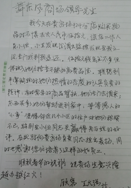 舞东风从成立发展到现在,一直坚持为顾客提供优质的服务,正是有了0924棕树南街分店这样可爱的同事们拾金不昧的高尚品质,才使我们赢得了社会的认可,从而不断壮大。