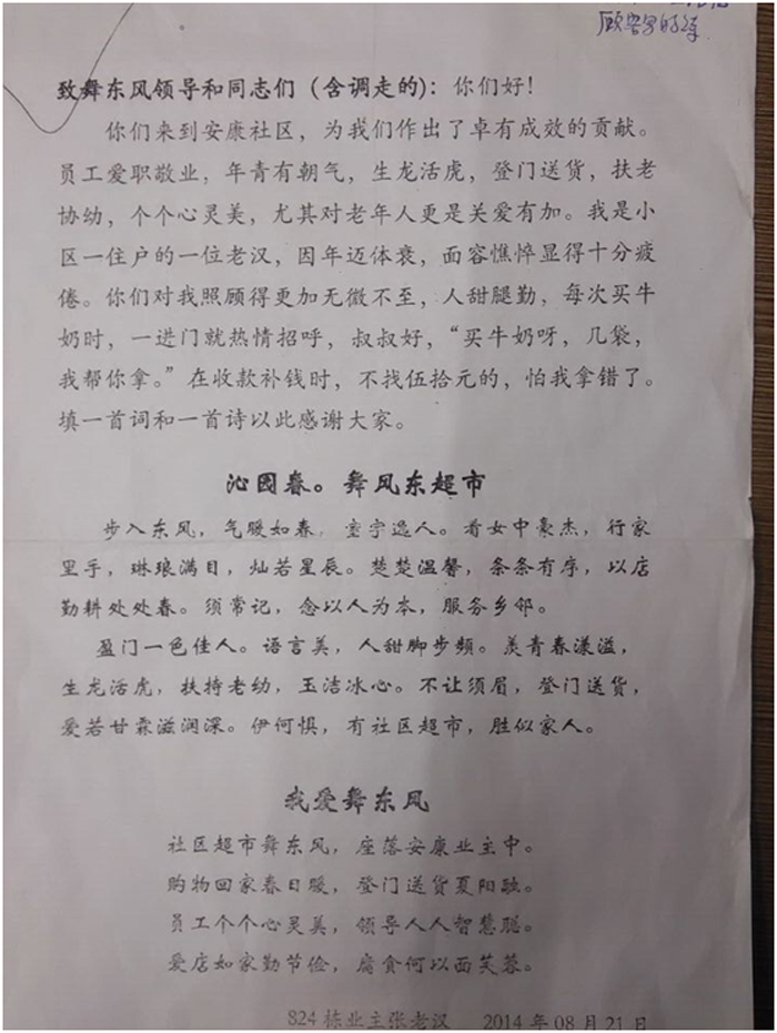 你们来到安康社区,为我们做出了卓有成效的贡献。员工爱岗敬业,年青有朝气,生龙活虎,登门送货,扶老协幼,个个心灵美,尤其对老年人更是关爱有加。我是小区住户的一位老汉,因年迈体衰,面容憔悴显得十分疲倦。你们对我照顾得更加无微不至,嘴甜腿勤,每次买牛奶时,一进门就热情招呼,叔叔好,“买牛奶呀,几袋,我帮你拿。”在收款补钱时,不找伍元的,怕我拿错了。填一首词和一首诗以此感谢大家。